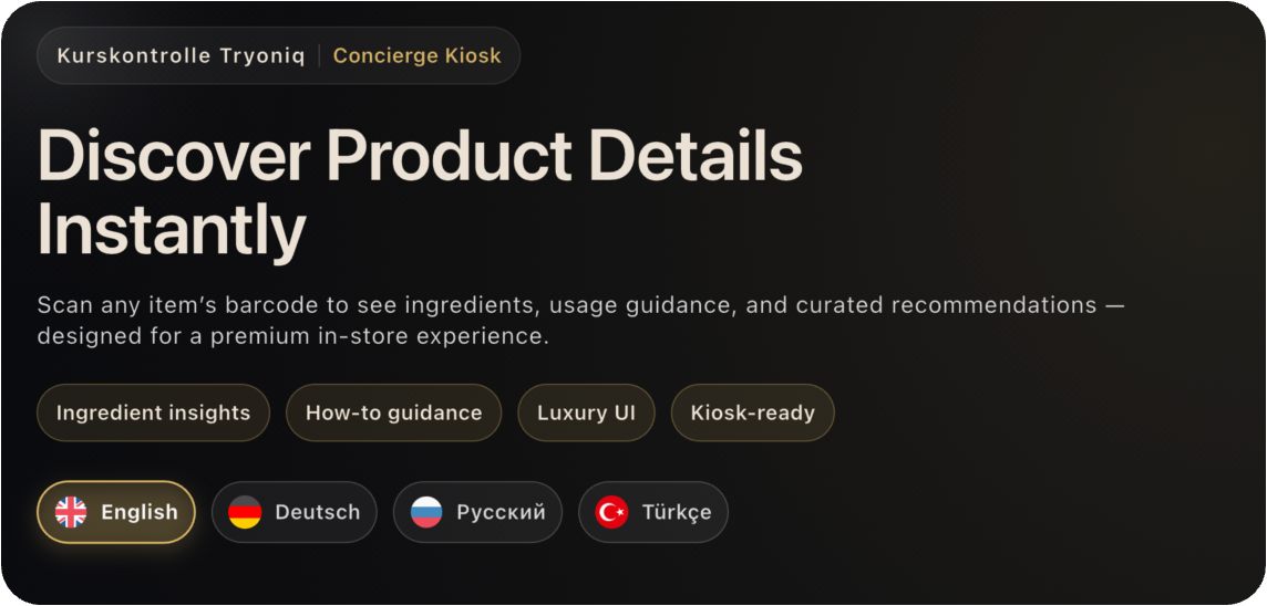 Customers scan a product’s barcode directly at the terminal and instantly receive structured information: ingredients, usage instructions, curated recommendations and contextual product insights.